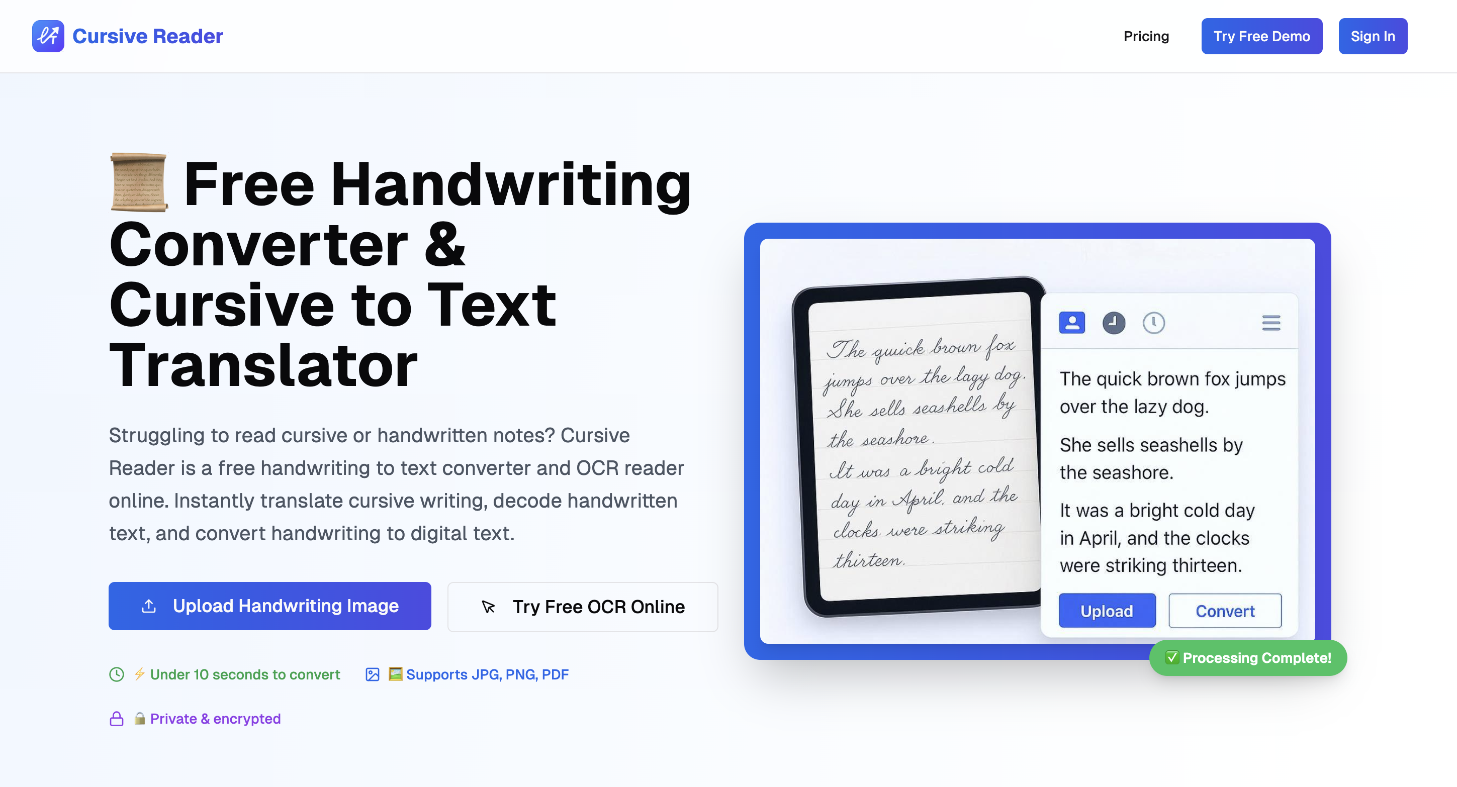 Designed with cursive writing in mind, Cursive Reader focuses on precision where most generic OCR tools struggle. It offers fast processing, export to Word/PDF, and strong privacy protections since files are never stored.